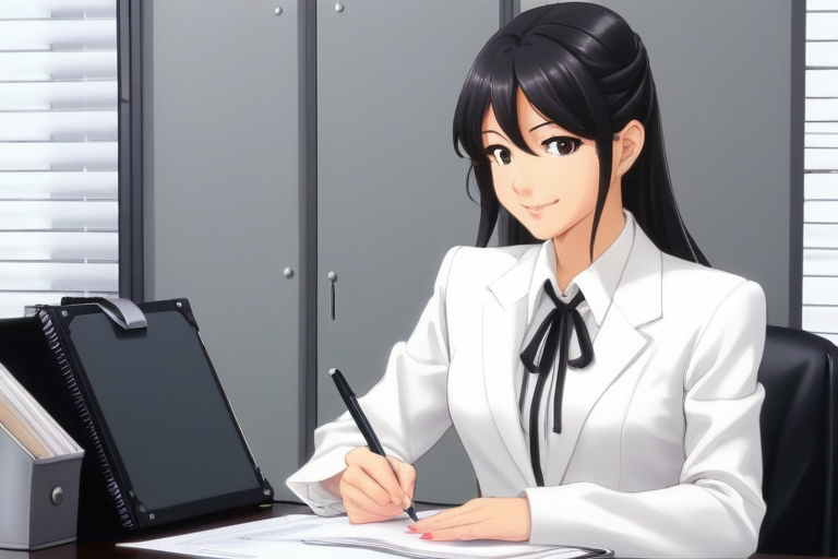 A professional anime character, female, in a confident pose, smiling encouragingly, extending an invitation to take the next step towards a brighter future.