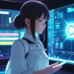 cute anime girl explaining something clearly, with charts in the background, confident smile