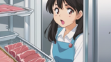 beautiful anime girl looking troubled, thinking pose, holding a credit card